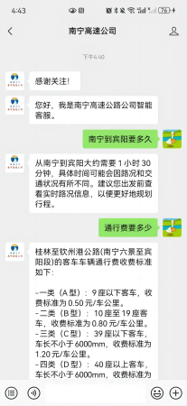 司乘只需關(guān)注“南寧高速公司”微信公眾號,點擊發(fā)消息即可輕松開啟在線咨詢之旅。這種將AI智能客服融入微信公眾號的方式,充分考慮了司乘人員的使用習慣,進一步拉近了企業(yè)與司乘之間的距離。